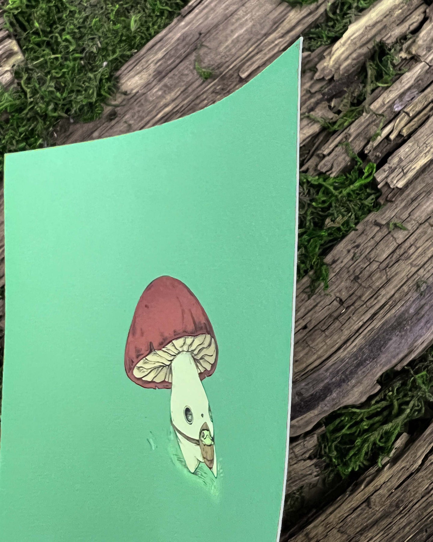 print of red capped mushling walking with a frog in a leafy fanny pack on his front